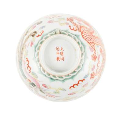 the deep rounded sides painted with a dragon and phoenix chasing a flaming pearl, the base inscribed with a six-character Tongzhi mark in iron red