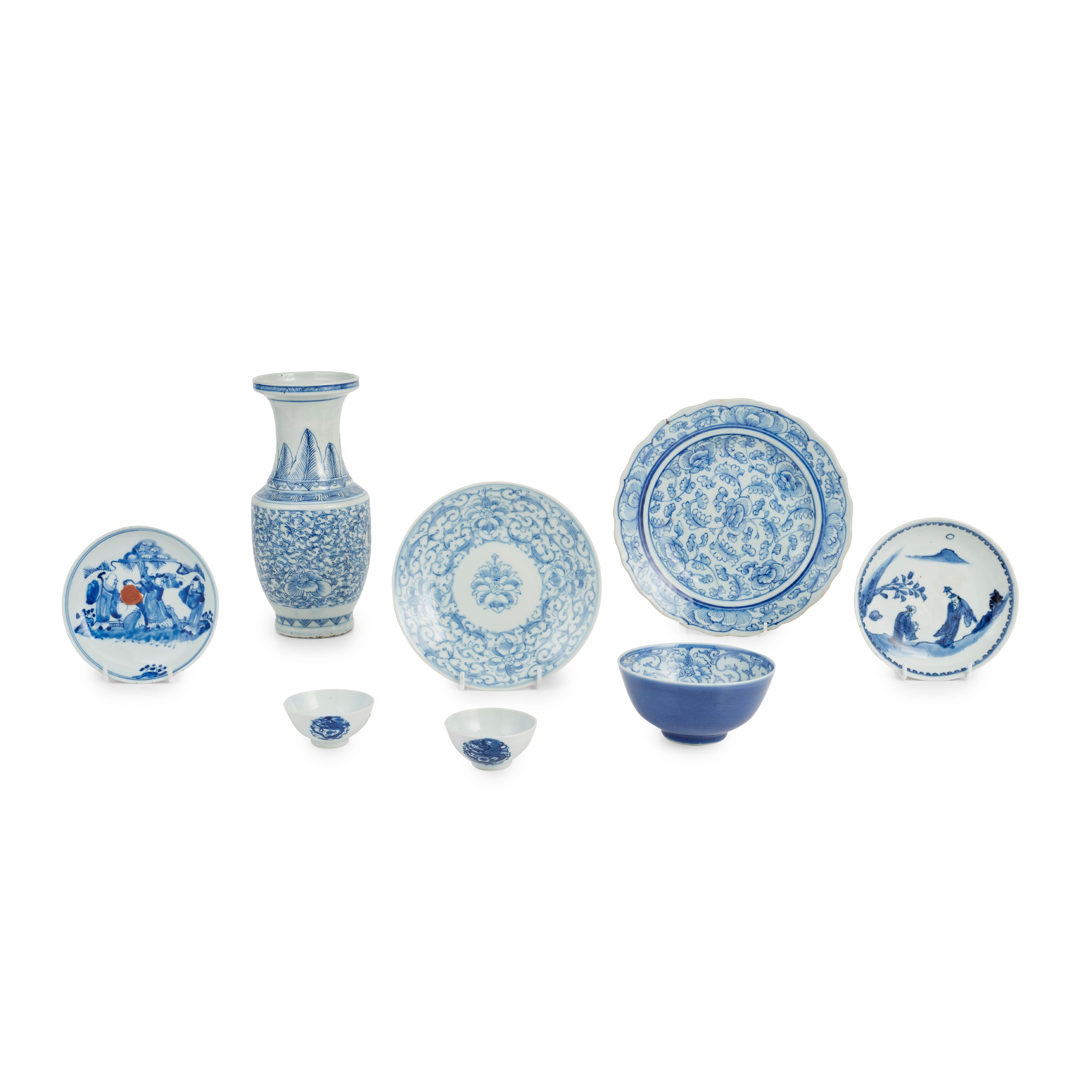 comprising: a baluster vase; a blue-glazed and floral-decorated bowl, with Jiaqing mark; a ko-sometsuke dish decorated with Sanxing deities, the base with yu mark; a ko-sometsuke dish painted with a hermit with his attendant; a dish with scrolling flowers, with Daoguang mark; a foliated dish; two small 'dragon' cups, with motif marks