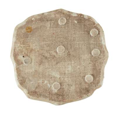 of baluster form with angled sides, the exterior painted with various antiquities amongst flower branches, the domed cover similarly painted and surmounted with a moulded lion final, the flat base unglazed and revealing the porcelain body
