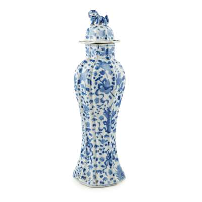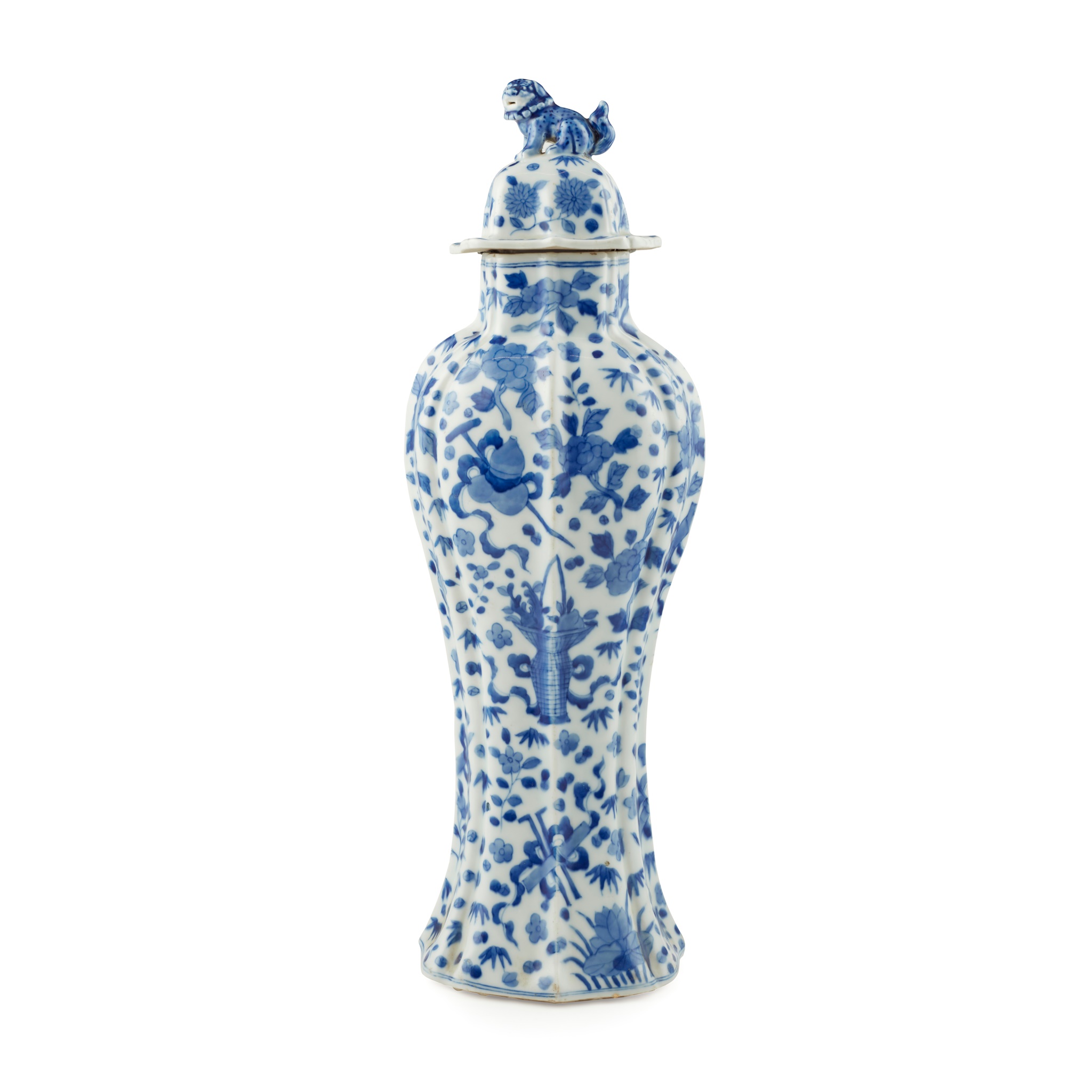 BLUE AND WHITE 'ANTIQUITIES' FOLIATE VASE WITH COVER