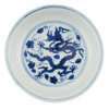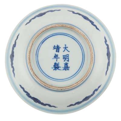 the interior painted with a five-clawed dragon amidst flowery tendrils in a medallion, the exterior further adorned with six ruyi-head clouds, the base inscribed with an apocryphal six-character Jiajing mark in underglaze blue