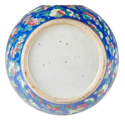 comprising: a Straits-Chinese famille rose vase, 19th-20th century, painted with birds and floral sprays against a blue ground; two pairs of blue and white Nanking cargo cups and saucers, Qing dynasty 18th century; and a blue and white bowl, Ming dynasty, Chenghua mark, decorated with butterflies on the exterior