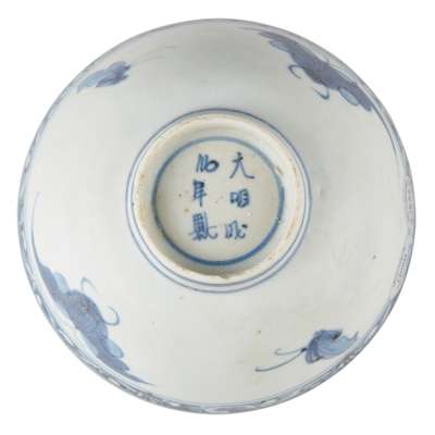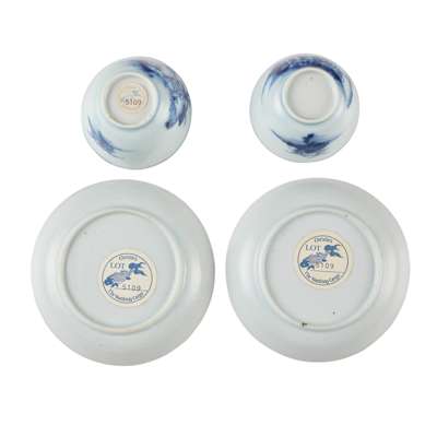 Both of the Nanking cargo dishes and one cup with labels on the base 'Christie's The Nanking Cargo Lot 5109', the other with a similar label but 'Lot 5110'; The bowl with two labels underneath the mouth rim, 'NANHAI MARINE ARCHAEOLOGY 7431' and 'Nanhai Marine Archaeology WanLi'
