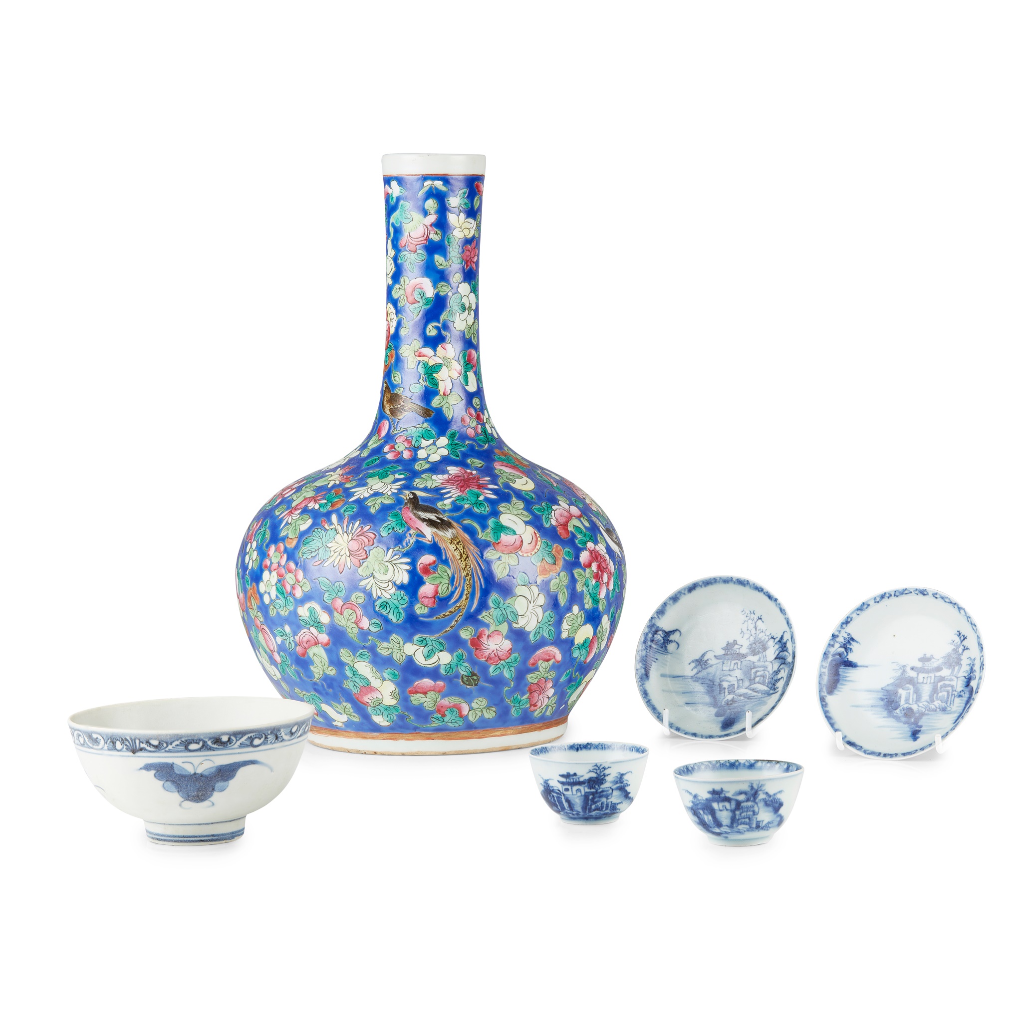 十九至二十世紀 娘惹粉彩花鳥紋瓶、清 ‘南京號’ 海撈青花山水人物圖杯盞兩對 及 明 成化款 ‘萬曆號’ 海撈青花蝴蝶紋碗(共六件)