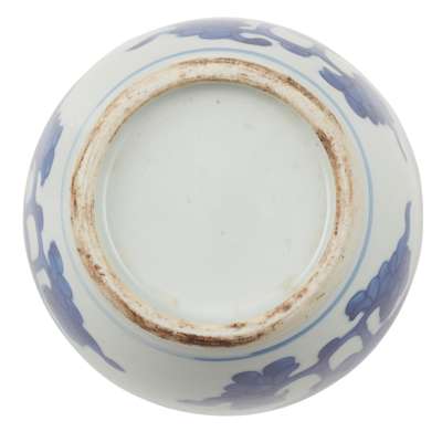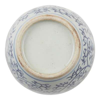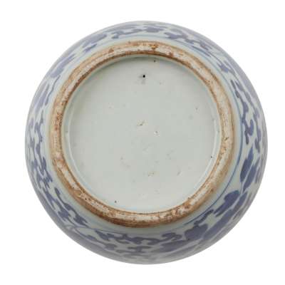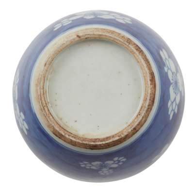 each of similar bulbous form and with different floral decorations, one with prunus flowers against blue ground, one with large stylised flowerheads, one with lotus in tendrils, and one with large peony blossoming flowers and buds