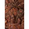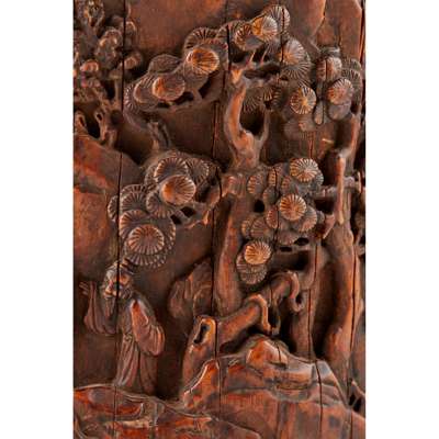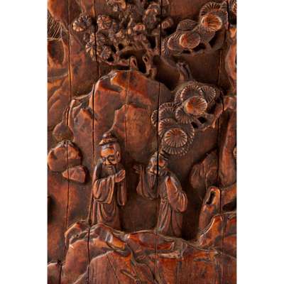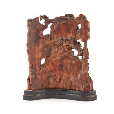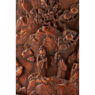 carved from a whole piece of wood, of slightly curved form, the convex side finely carved in high relief and openwork with small figures, buildings, waterfall and pine trees amidst mountainous landscape, the concave reverse carved in a multi-tiered pagoda alongside two large pine trees issuing from rockworks, with a fitted wooden base