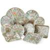 comprising: a charger, 37.7cm diameter; a large plate, 30.2cm diameter; five plates, 24cm to 20.4cm diameters; three rectangular dishes, 24.7cm to 20.9cm widths; and a big bowl on wooden stand, 21.2cm diameter, all similarly decorated with flowers and figures