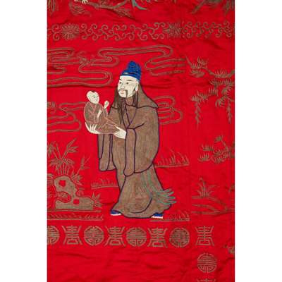 decorated in gold thread and embroidery with the Sanxing deities on top and two rows of the Eight Immortals on both sides enclosing a shou-character rectangular panel with four characters 'Zhong Wai Xian Qin' (admired locally and internationally), further with recipients and donors' names