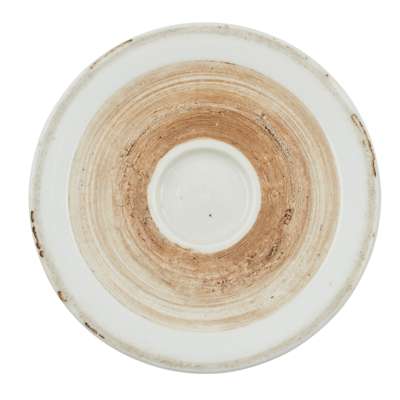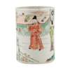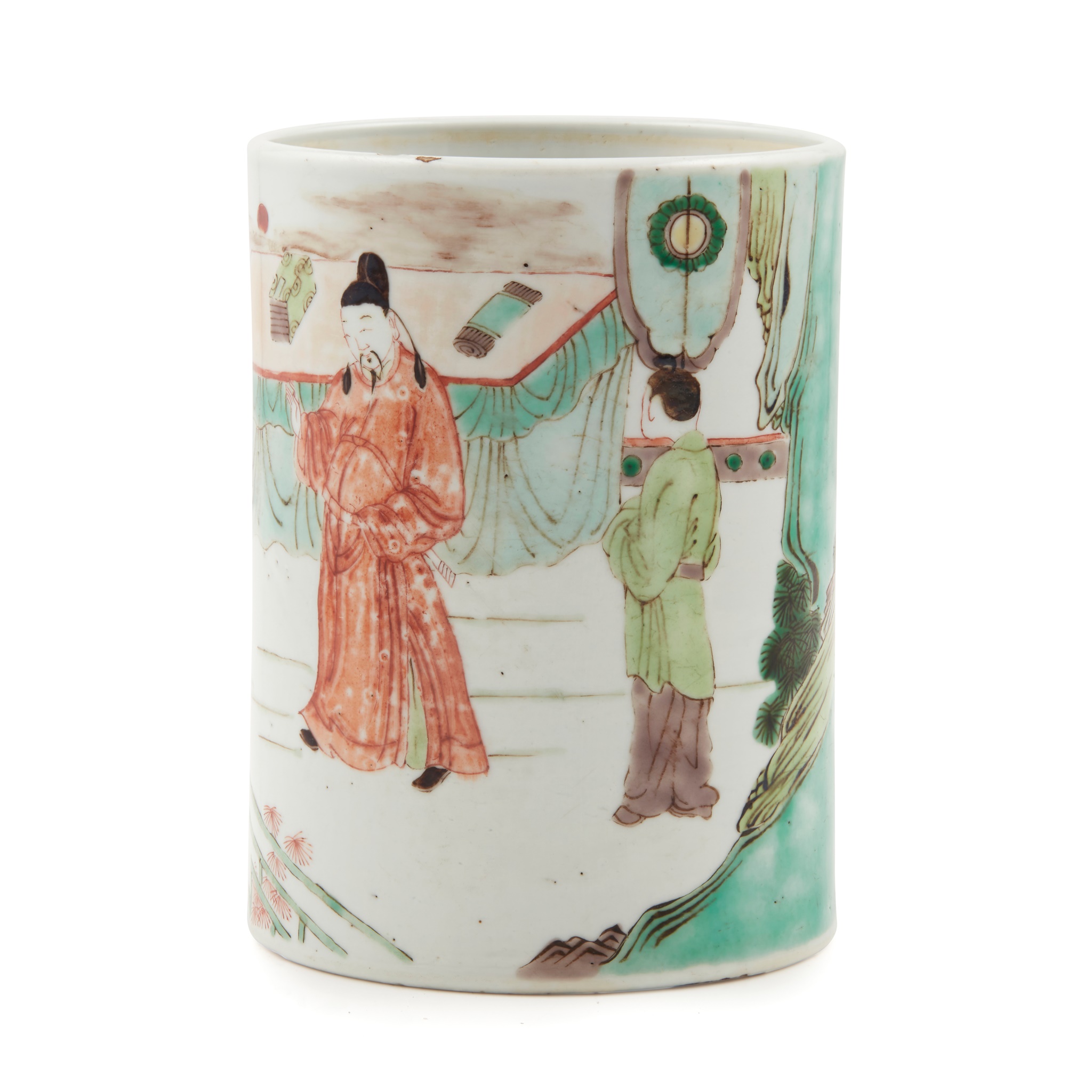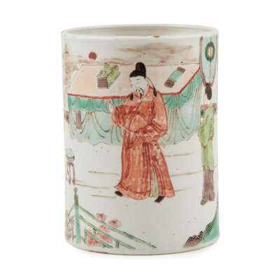 of cylindrical form, the exterior painted with an officer dressed in red official robe standing in a pavilion furnished with desk and screen, accompanied by two attendants