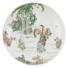 the interior painted with a scholar placing a red chrysanthemum on to his hairbun, accompanied by his attendant in front of two large flower pots, the scene in a garden setting with large plantain trees and rockworks