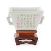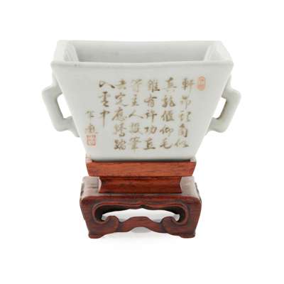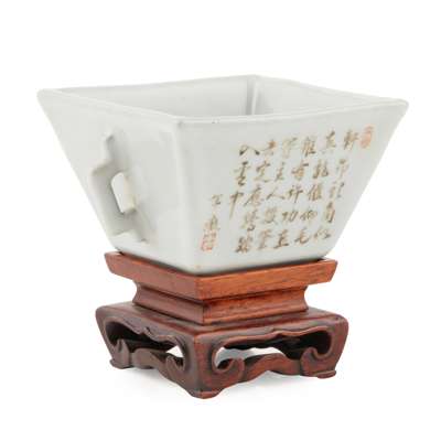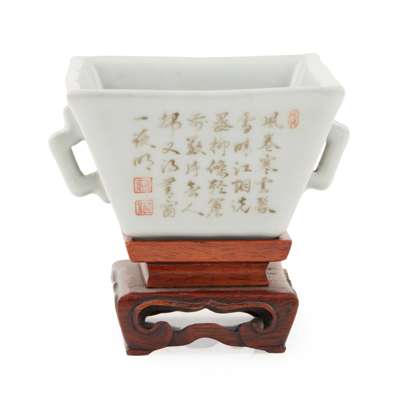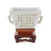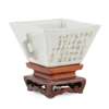 two sides set with a pair of bracket handles, other two sides inscribed with poetry, one signed 'Ban Chi', the other sealed 'Tao' 'Ming', the base with a four-character Qianlong mark in iron-red, with a fitted wooden stand