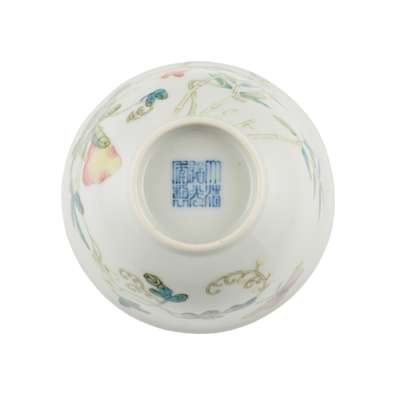 each delicately potted, the deep rounded sides decorated on the exterior with fruiting and flowering pomegranates with bamboo and butterflies in flight, the decoration continues over the slightly everted rim into the interior, the ripe fruit bursting open to expose the seeds, the base inscribed with a six-character Daoguang mark in underglaze blue