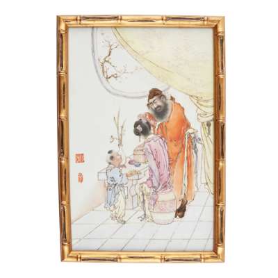 the rectangular porcelain plaque delicately painted with a bearded officer carefully placing blossoming flowers on his wife's head, with an attendant holding a plate of fruit aside, all in front of a round window half-covered by a draping curtain, with two iron-red paint seal on the left, one reading 'Wang Qi', with wooden frame