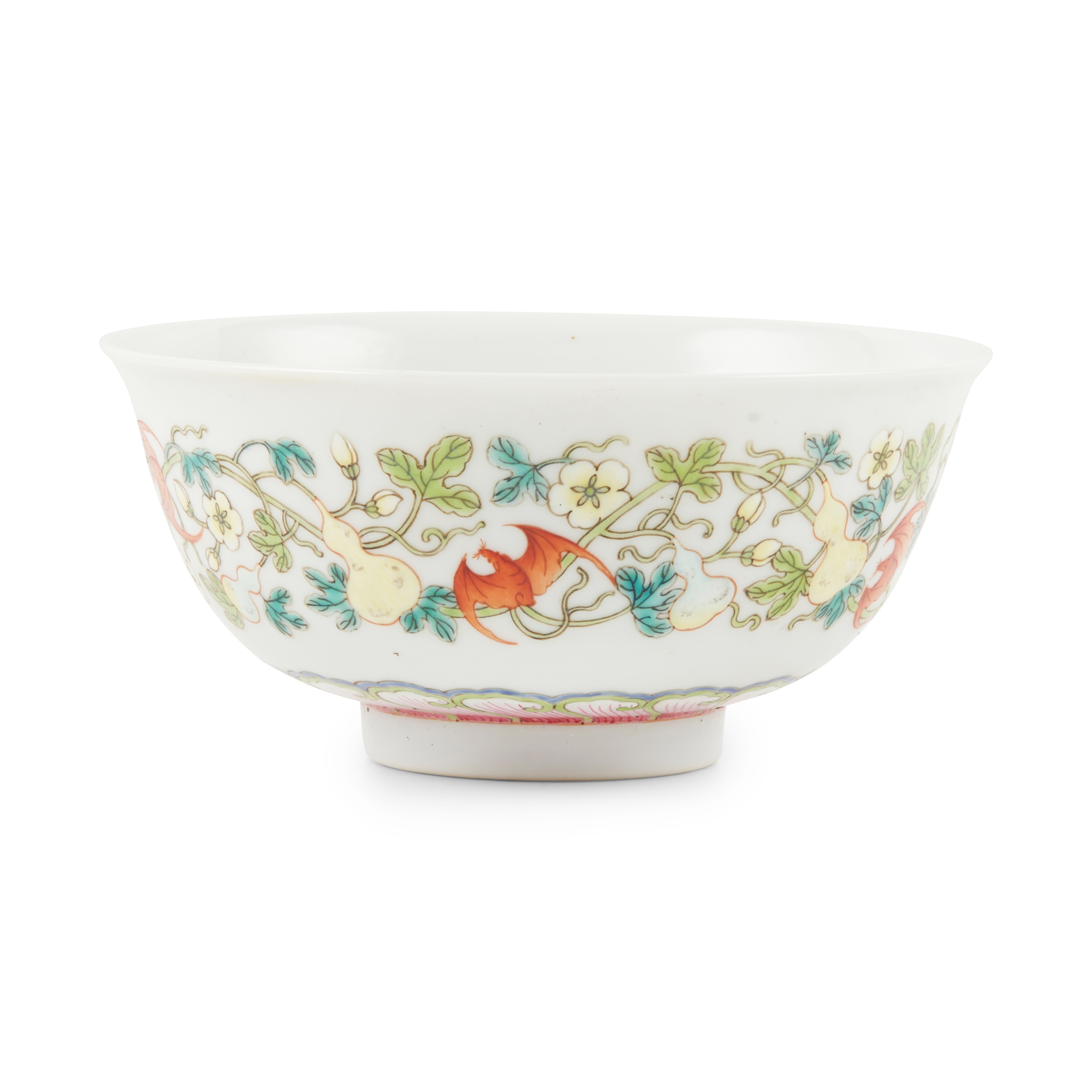 painted on the exterior with a band of tendrils bearing double gourds with bats in flight, the base inscribed with a six-character Yongzheng mark within a double-square panel in underglaze blue