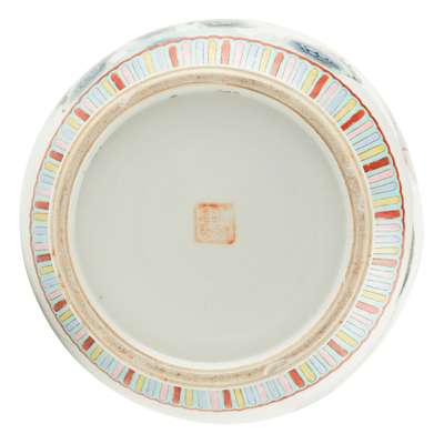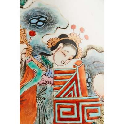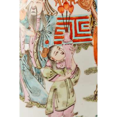 of baluster form, the bulbous body finely painted with Fu (fortune) deity carrying a babe over his shoulder, Lu (prosperity) deity in official court robe holding a ruyi sceptre, and Shou (longevity) deity in the form of an elder with a crutch, all three deities accompanied by other attendants in a fenced garden setting, the elephant-handled neck further decorated with Kui Xing, the Deity of Examination, the base stamped with a six-character Tongzhi mark