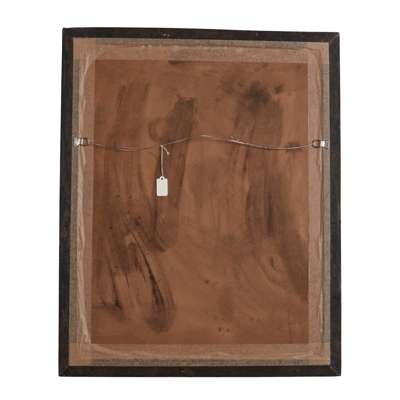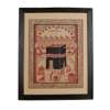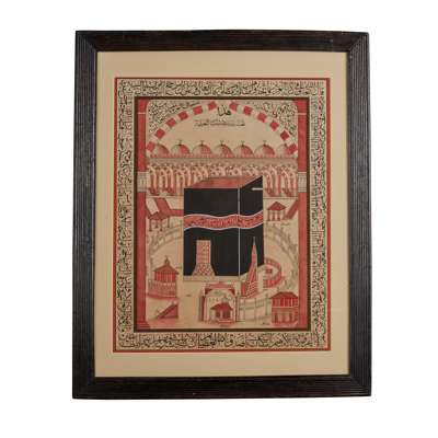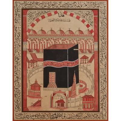 ink and watercolour on paper, the central image of the Ka’ba and surrounding shrines at Mecca, Arabic identifying inscriptions in the central section, verses from the Quran around the border, framed
