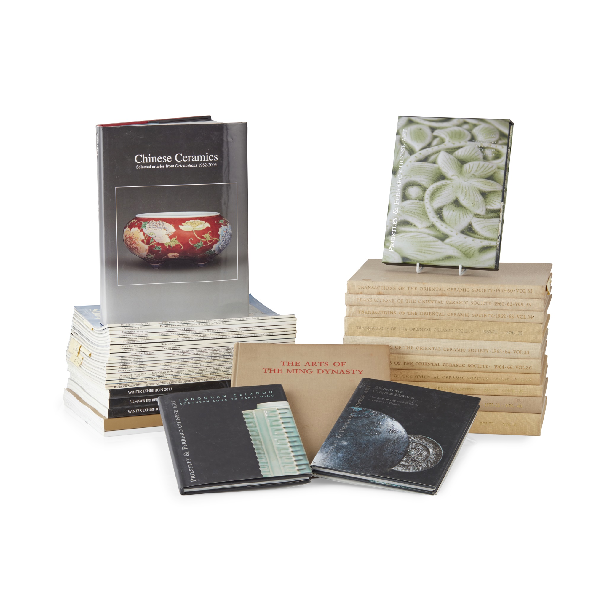 Approximately 115 copies of dealers catalogues on Chinese and Asian art; dealers including Roger Keverne (non-consecutive 1998-2013), Ben Janssens (non-consecutive 1998-2020), Priestley & Ferraro (non-consecutive 1996-2022), Gerard Hawthorn (1997-2008) and the Oriental Art Gallery Ltd. (1992-1993); 22 copies of Transactions of the Oriental Ceramic Society ranging from 1959-2006 (volumes 32-48 and 66-70), and 4 exhibition catalogues by the OCS, including The Arts of the Ming Dynasty, 1957; The Arts of the Tang Dynasty, 1955; The World of Blue and White, 2003; and The World in Colours, 2006; and 27 copies of Orientations ranging from 1988-1994, and a copy of Chinese Ceramics: Selected articles from Orientations 1982-2003, Hong Kong: Orientations Magazine Limited, 2004.approximately 170 total in the lot