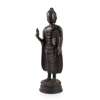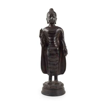 cast standing on a lotus podium, right hand raised and left hanging naturally, both in vitarka mudra, benevolent face with an urna, thick wavy hair piled up to a high ushnisha