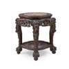 the circular rouge marble-inset top above a pierced and carved 'dragon' frieze, raised on dragon carved cabriole legs, united by stretchers inset with a 'coin' plaque