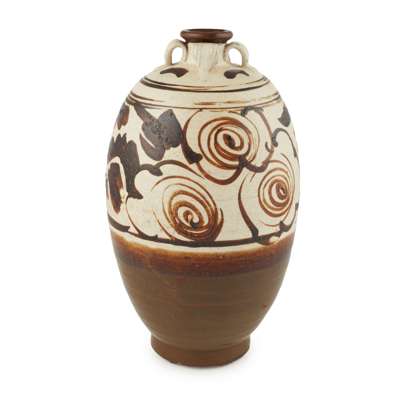 宋/金到元 磁州窯白地褐彩花卉紋四繫瓶