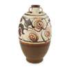 of spindle shape, supported on a short splayed foot and surmounted with a short neck with everted rim, with four small handles near the mouth, the upper body covered in cream glaze and dark brown paint with a floral motif, and covered in dark brown on the lower body and the base, with some kiln grits attached to the foot ring