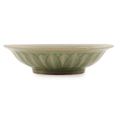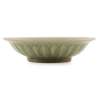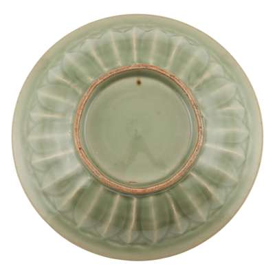 heavily potted with deep fluted sides carved with upright lotus petals on the exterior, rising to an everted rim, the interior decorated with a pair of fish, covered overall with an even green glaze thinning on the widest parts with mushroom tone