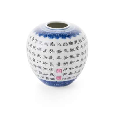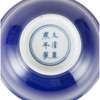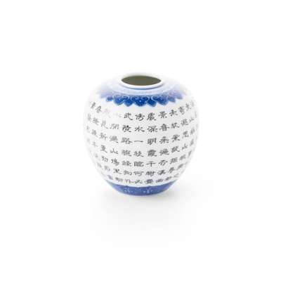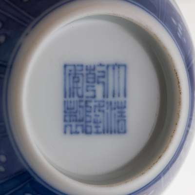 comprising: a blue and white waterpot, of ovoid form, inscribed on the body with imperial poems entitled Xiao yuan xian yong wu shou (Five verses from the small leisure orchard), end of poems with two seals 'Qian' 'Long', enclosed by a ruyi band on shoulders and a band of lappets above the foot, the base inscribed with a six-character Qianlong mark; and a blue-glazed bowl, the exterior covered in a thick blue glaze, the base inscribed with a six-character Kangxi mark in double-circle