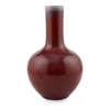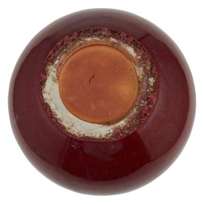 sturdily potted with a globular body and a straight neck, covered overall with an uneven red glaze suffused with lavender and blue streaks