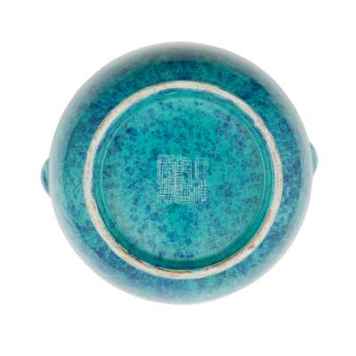 the slender ovoid body with a waisted neck and flared rim, with two vase-shaped handled moulded on either side, vividly applied overall with a turquoise-blue glaze suffused with dense dark blue network, the base incised with a six-character Qianlong mark