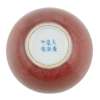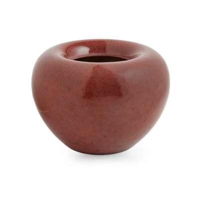 the globular body tapering down to the foot and curving inward to the mouth, the exterior covered with a mottled crushed strawberry-red glaze, the counter-sunk base inscribed with a six-character Kangxi mark in underglaze blue