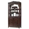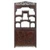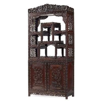 the lower section raised on four feet, doors carved in low relief with flowering peonies issuing from curling and leafy stems, revealing a shelf and two drawers to the interior, the upper part with a geometric arrangement of open shelves