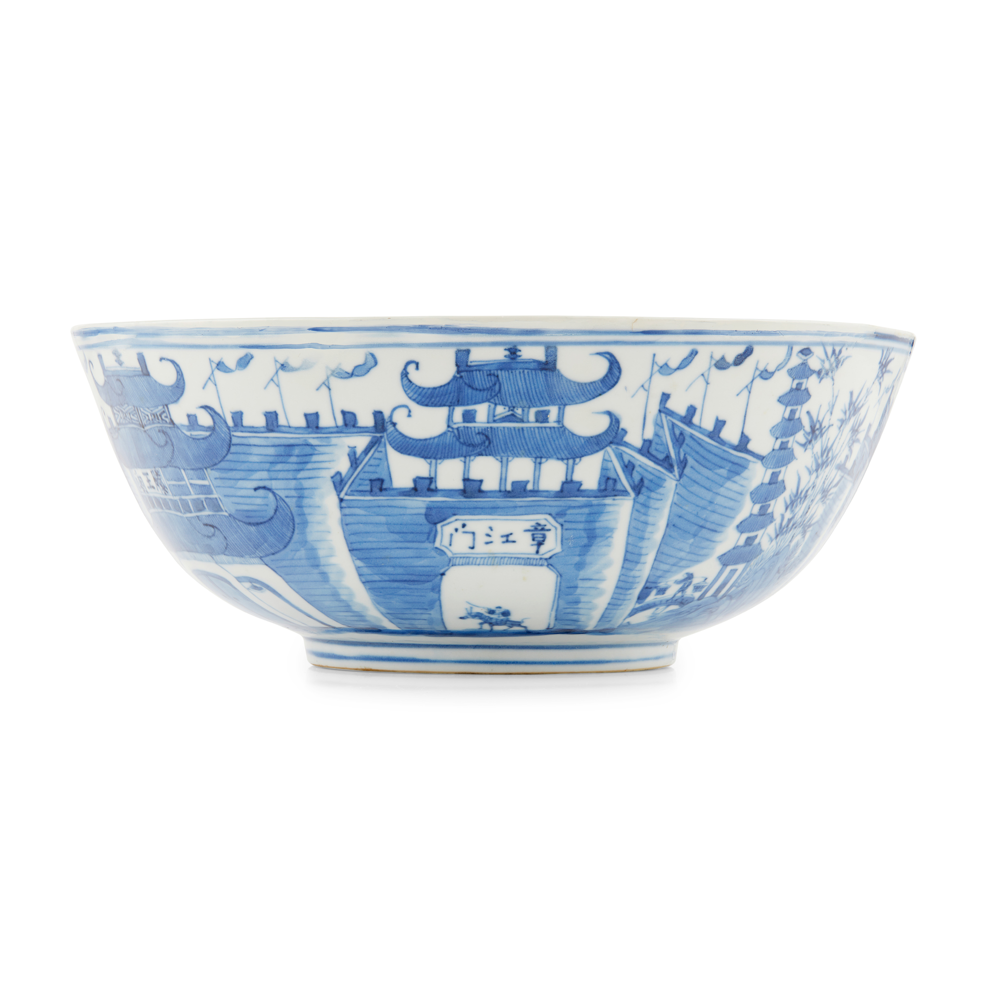 the exterior decorated with a continuous scene of Nanchang city, one of the main entrances ‘Zhangjiang Men’, a pagoda ‘Tengwang Ge’, houses, a temple and sampans, the base inscribed with an apocryphal four-character Kangxi mark