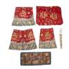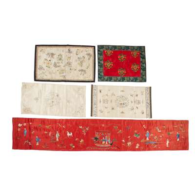 comprising: a set of four remnants from a red dragon robe; three on ivory ground depicting figures, flowers, and butterflies; two on red ground with figures and flowers; one on brown ground with crane and deer; and a fan holder decorated with raised insects and flowers (11)