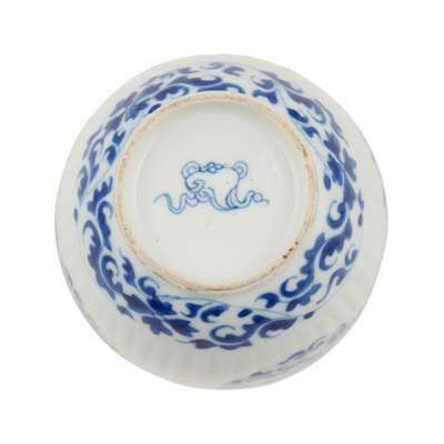 BLUE AND WHITE RIBBED JAR AND DOUCAI WINE CUP