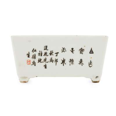 of tapered form raised on bracket feet, two sides of the exterior painted with birds and flowers, the other two inscribed with poem, dedicated to mister Yun Qian, signed ‘Xian Chai’, dated to the year of Ding Mao, corresponding to 1927AD, the base with a four-character studio mark ‘Ying Lian Xuan Zao’