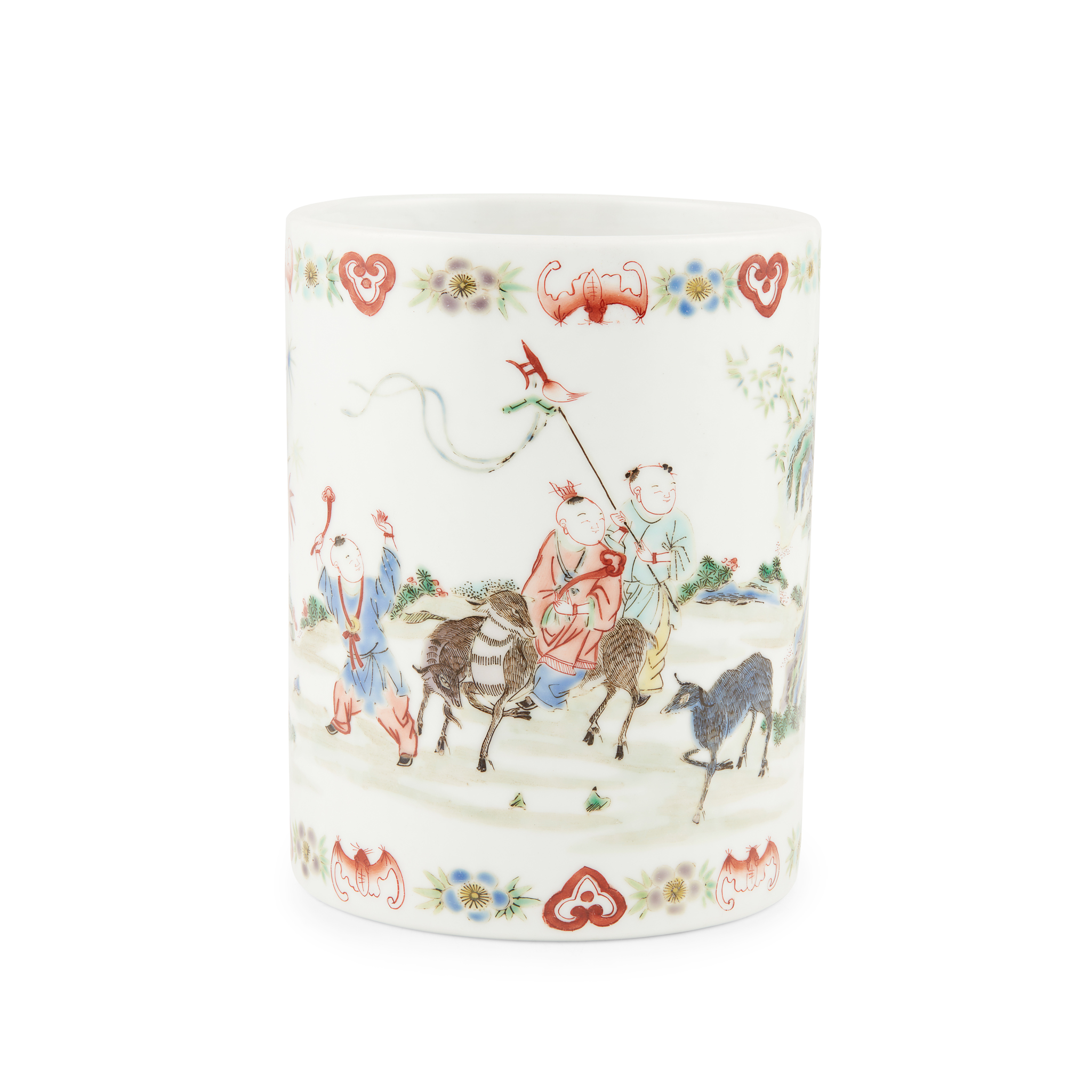 of cylindrical form, the straight sides painted with two groups of boys playing lanterns and riding on deer in a garden setting divided by stylised rock, encircled by two bands composed by ruyi, flower head and bats