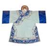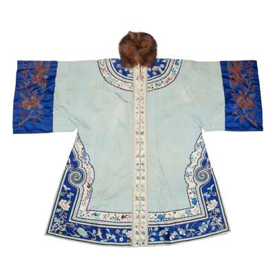 embroidered with colourful blossoming flowers and fruits all over, hemmed with ivory and bright blue coloured bands with similar decoration, the wide short sleeves ending decorated with phoenix on blue ground, with a later attached fur collar