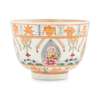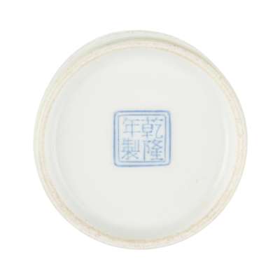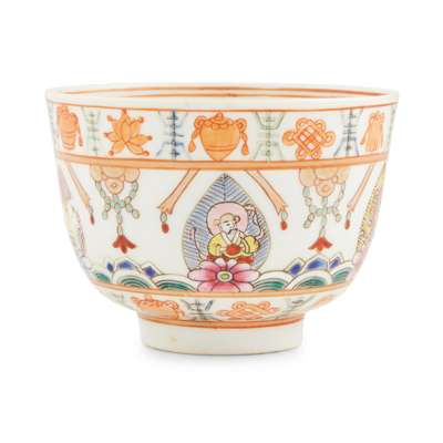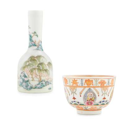 one small famille rose mallet vase decorated with a small sampan in a continuous landscape scene, the base enamelled with a four-character Qianlong mark in blue; and one famille rose ‘baragon tumed’ cup, enamelled with the Buddhist emblems including the Wheel of the Law, Elephant, Horse, Jewel within leaf-shaped panels supported on lotus blossoms, the interior with a single lotus, the base inscribed with ‘baragon tumed’ mark in Mongolian script in iron-red