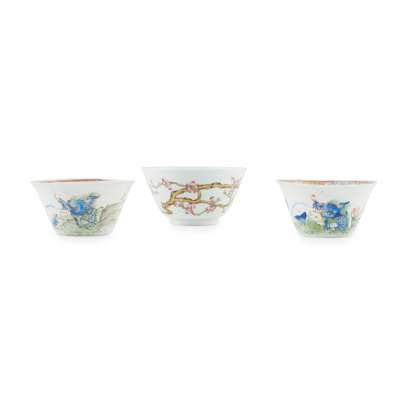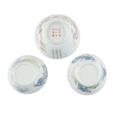 comprising: a pair of cups each painted on the exterior with a sea creature issuing a cloud from its mouth with a house atop, a phoenix in flight; and the other decorated with prunus on one side, the reverse inscribed with a poem, the base with a nine-character Daoguang mark (3)