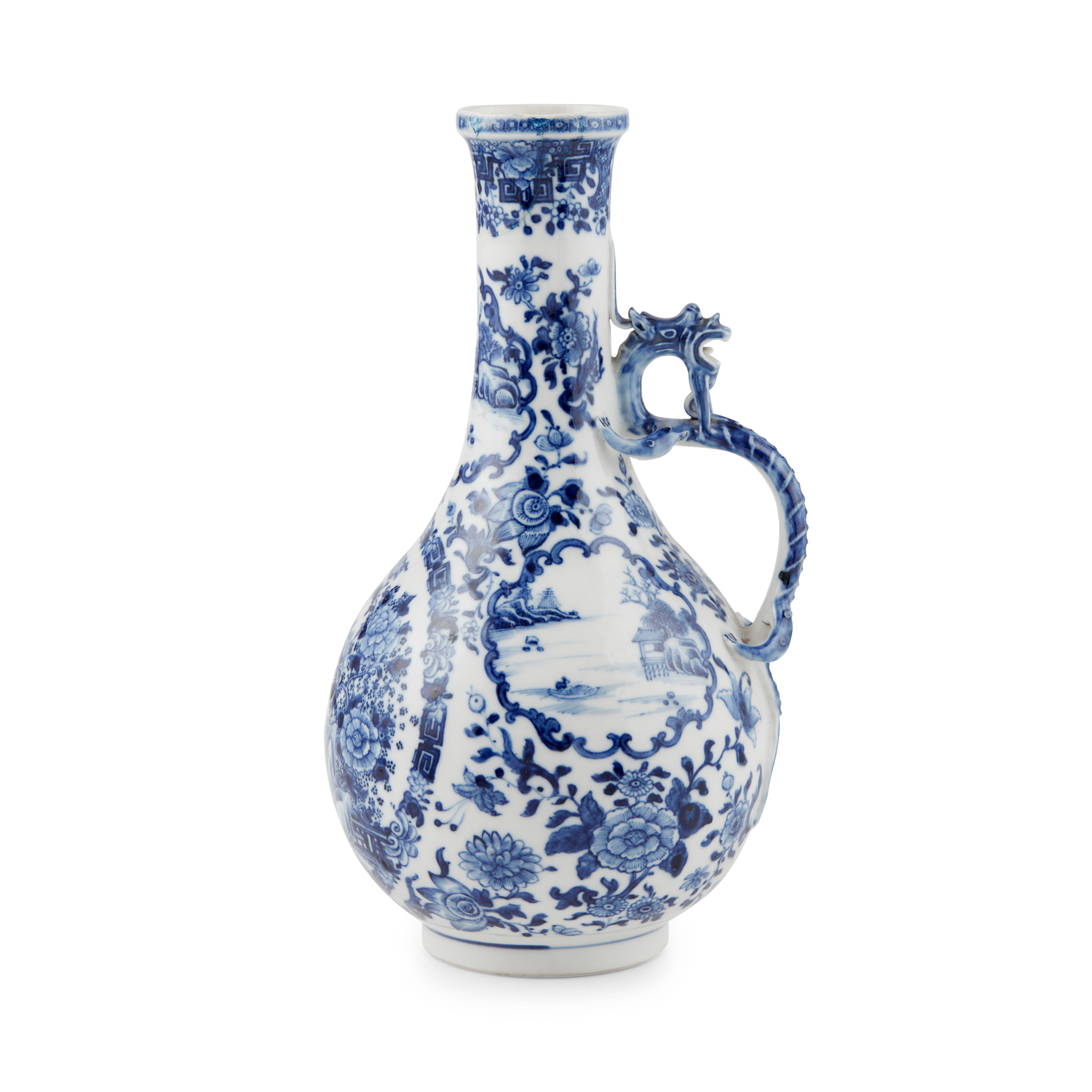 清乾隆 青花山水花鳥紋塑蟠龍把壺