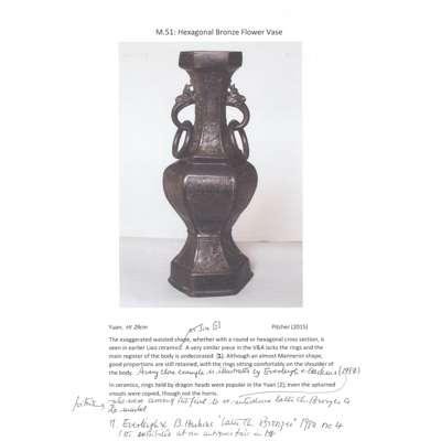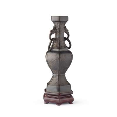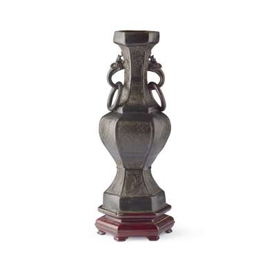 A pair of comparable examples, of slightly simpler form, Yuan/ Ming dynasty, sold at Sotheby's New York, 21 March 2015, lot 763; Also compare to a related vase, lacks the rings, dated to the Yuan dynasty, 13th-14th century, in the Victoria and Albert Museum, accession no. 186-1876, also illustrated in Ross Kerr, 1990, Later Chinese Bronzes, London: Bamboo Publishing, pl. 38, pg. 49.