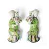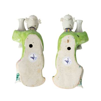 each modelled as a seated lady wearing brightly coloured robes decorated with blossoming flowers and ruyi-head clouds, holding a baluster vase painted with flower heads on either right or left shoulder, both her lower legs and a tiny bound foot are revealed from the pleated skirt (2)