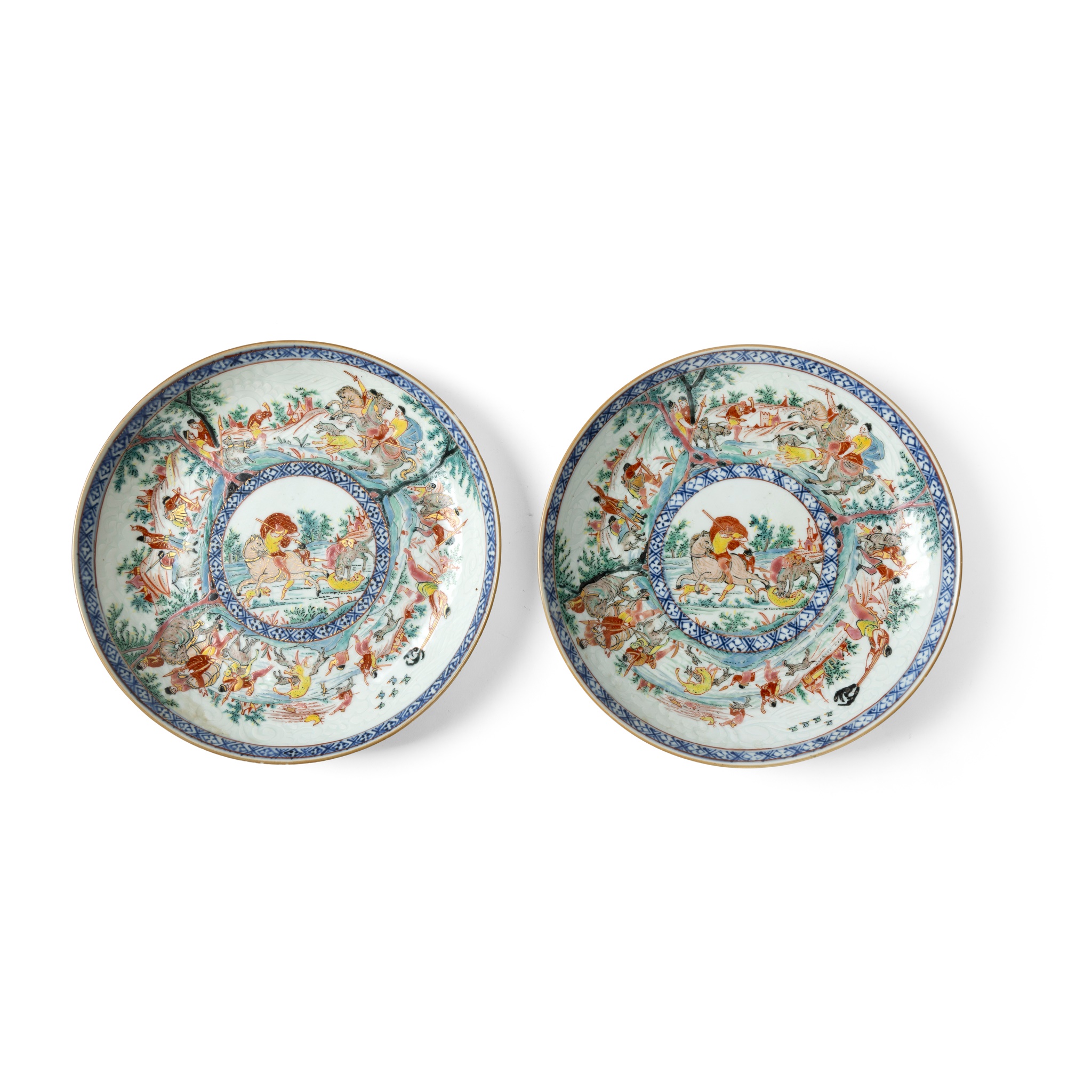 清雍正或乾隆 約1730-45 外銷瓷青花暗刻加荷蘭彩繪狩獵紋盤(共兩件)