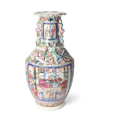 FAMILLE ROSE LION-HANDLED VASE