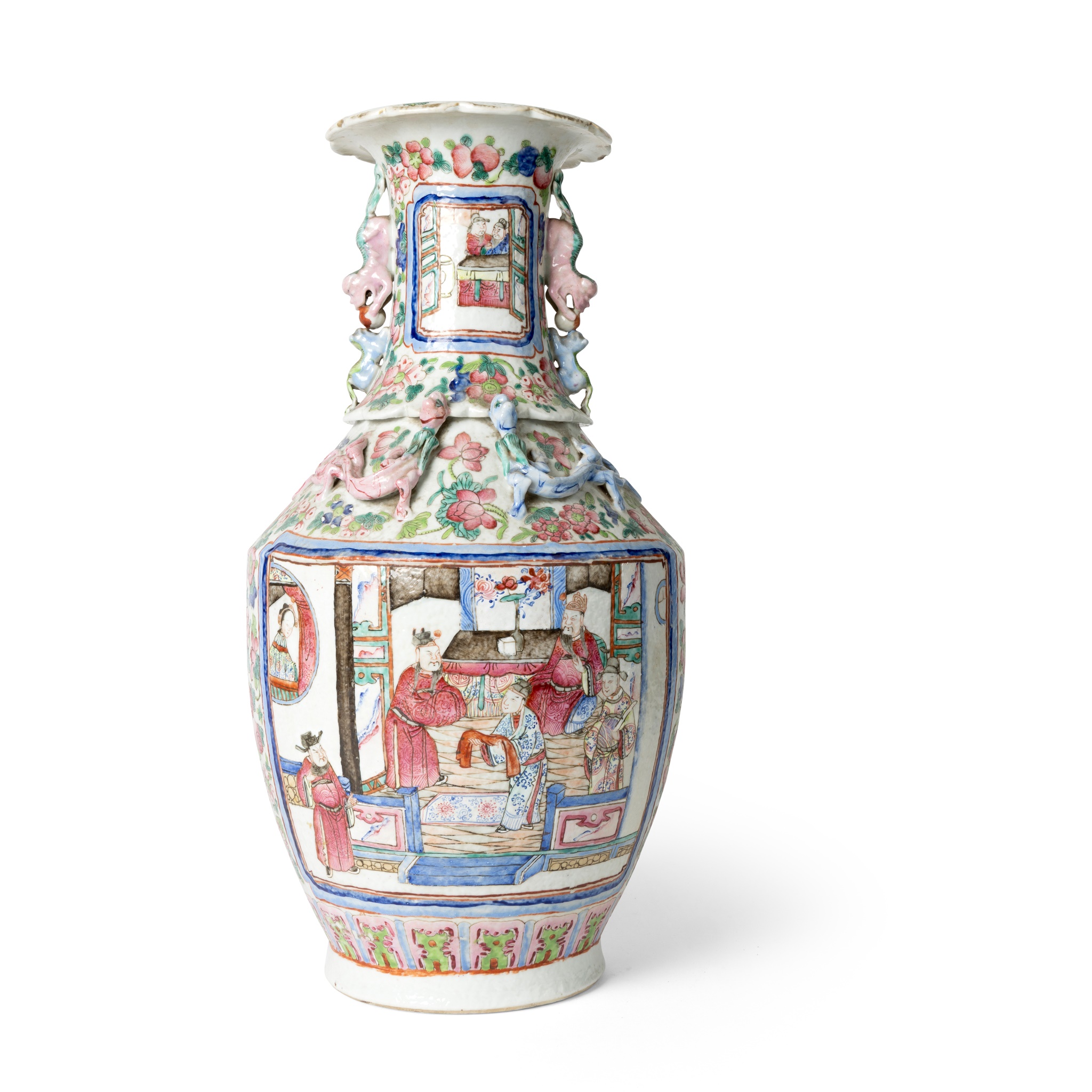 the bulbous body supported on a short splayed foot, the body finely painted with figures in pavilions within two square cartouches, all below two pairs of chi-dragons on the shoulder against a floral ground, the neck flanked by a pair of double-lion handles underneath the foliate rim