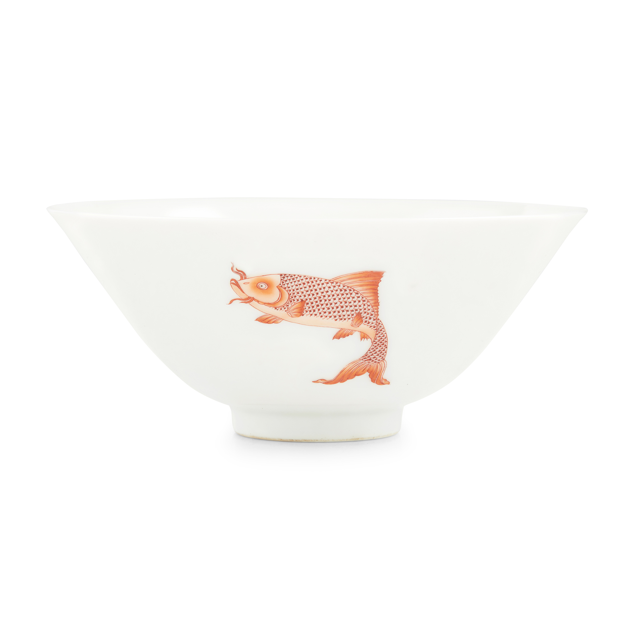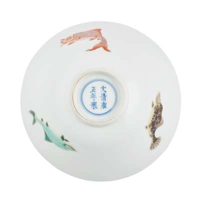 the exterior painted with three fish, the base inscribed with an apocryphal six-character Yongzheng mark in double-circle in underglaze blue