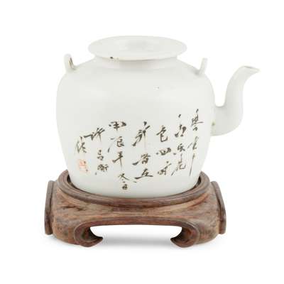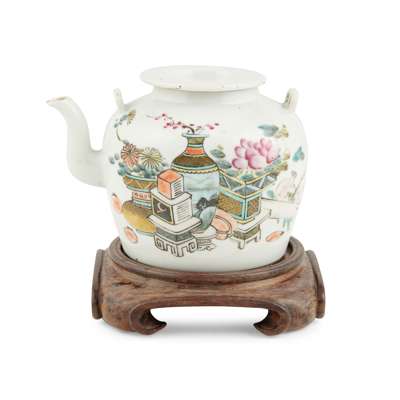 ‘许昌衡作’款 光緒底款 粉彩博古紋茶壺帶蓋 連木座