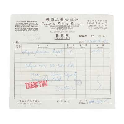 Private English collection, Brighton; acquired from Friendship Trading Company, Hong Kong (興華工藝古玩行)on 24th April 1995, with an original receipt stating the piece is of Qing dyansty, Tongzhi period.