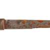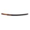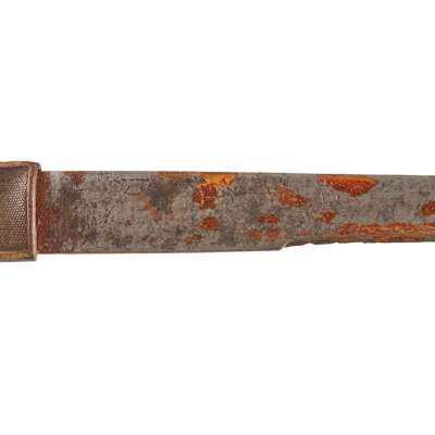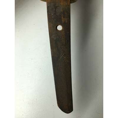 single-edged curved blade, tang marked and with single rivet hole, the wooden hilt with white ray-skin grip bound with tape, a menuki bound on each side and with kozuka with signed blade, raised rooster designs to the hilt, the patinated iron tsuba with raised white metal stork standing on one leg, in its plain black lacquer scabbard