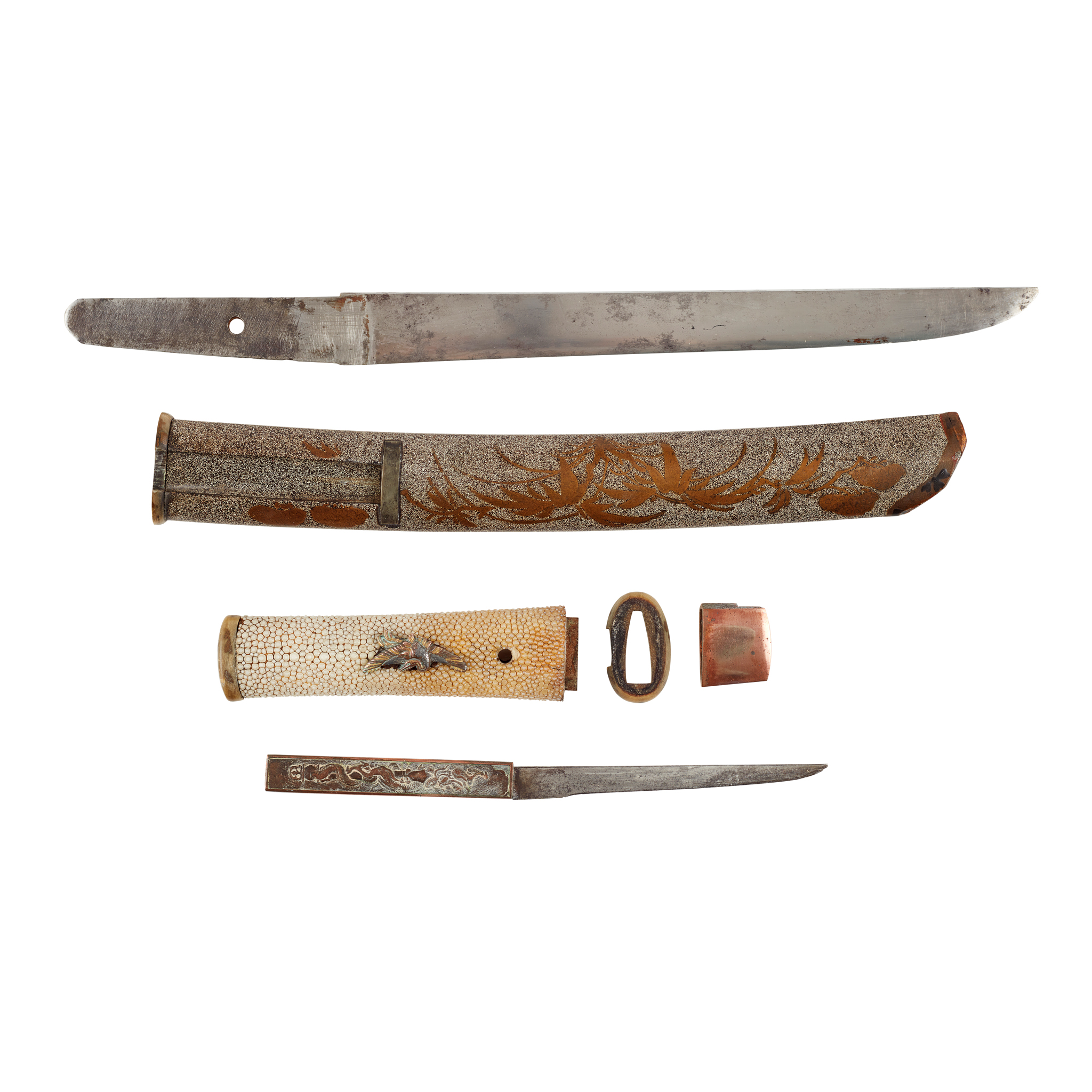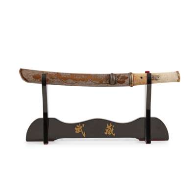 single-edged curved short unsigned blade, tang with single rivet hole, the white ray-skin grip with a single menuki in the form of a crane with outstretched wings, with its kosuka and fine floral decorated lacquer scabbard, black and gold lacquer stand